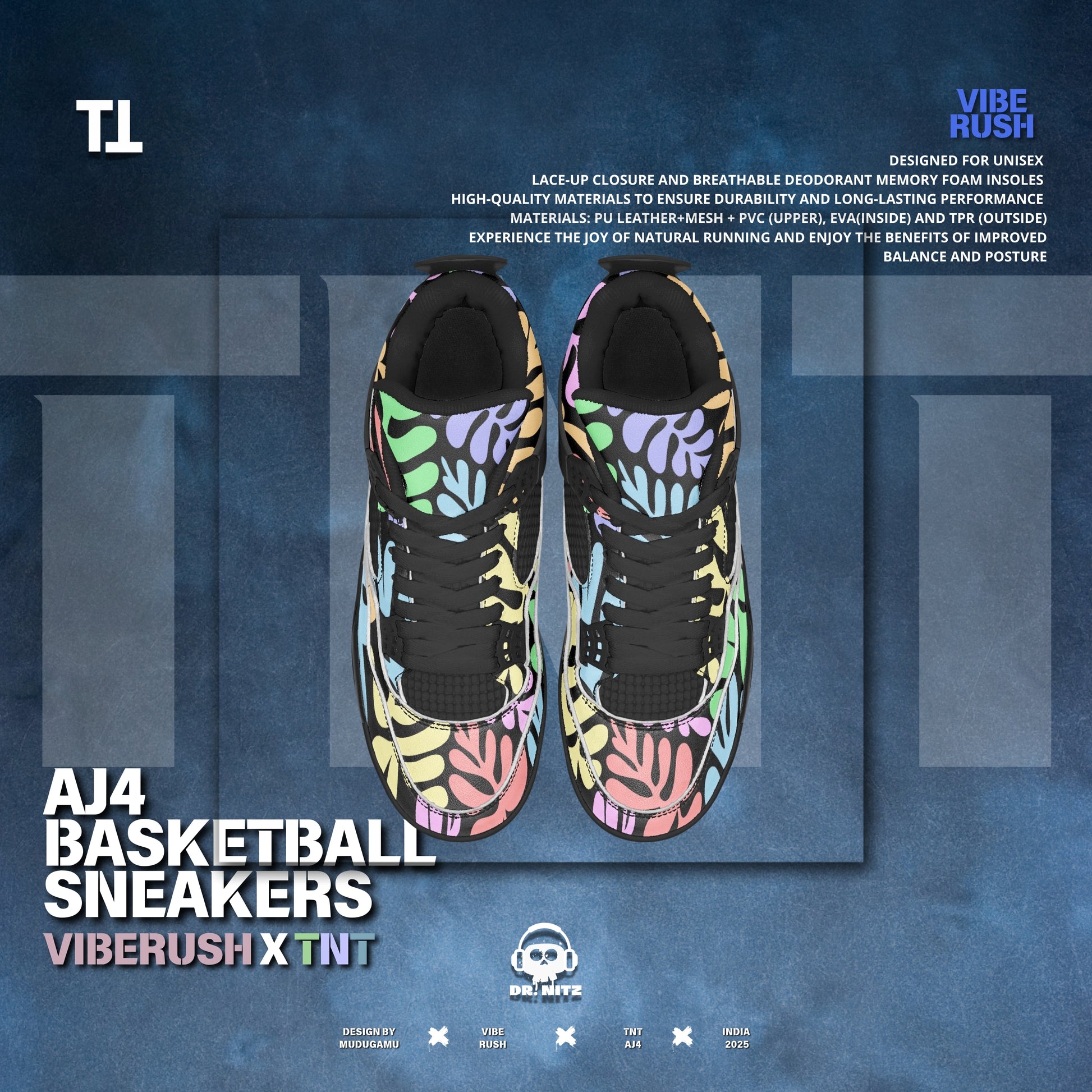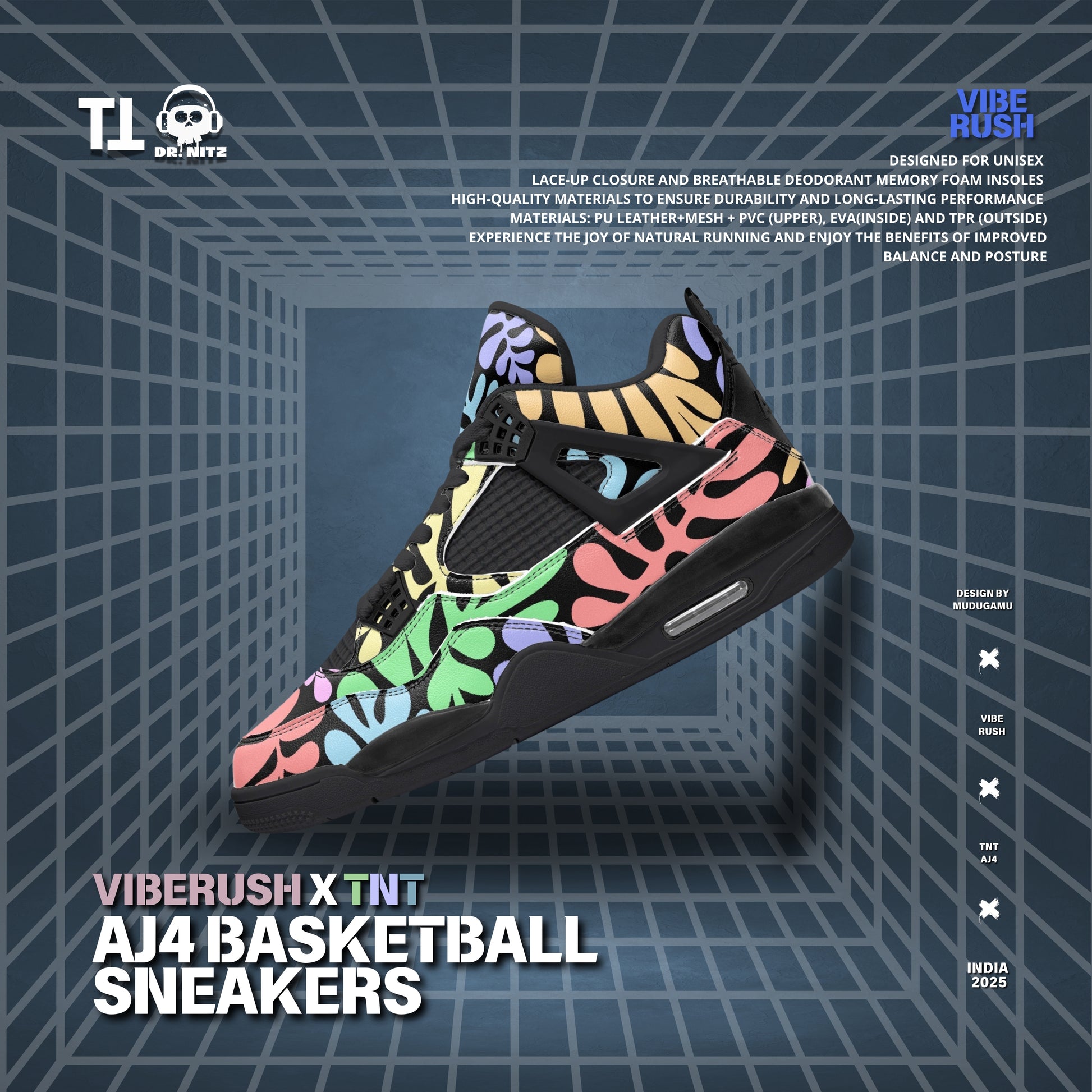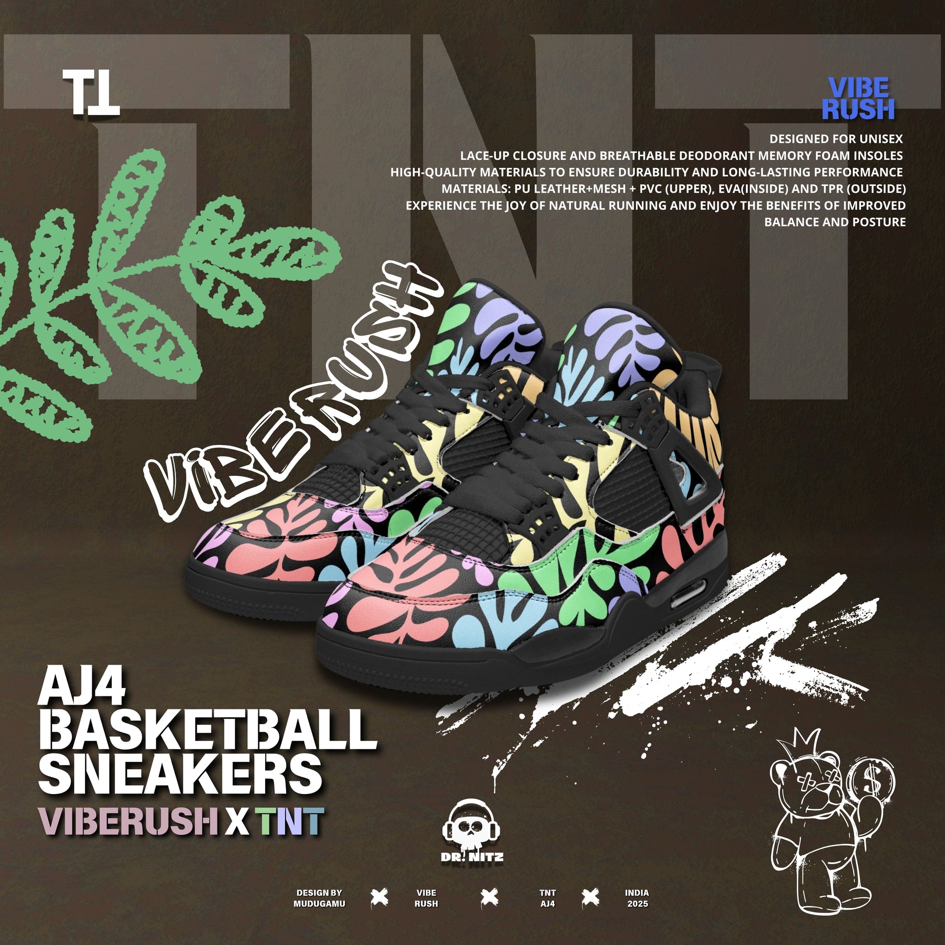 Step into the perfect blend of performance and street-style aesthetics with the VIBERUSH X TNT AJ4 Basketball Sneakers. Designed for those who demand both functionality and fashion, these sneakers bring high-quality craftsmanship, next-level comfort, and a bold pastel multicolor design that stands out on and off the court.